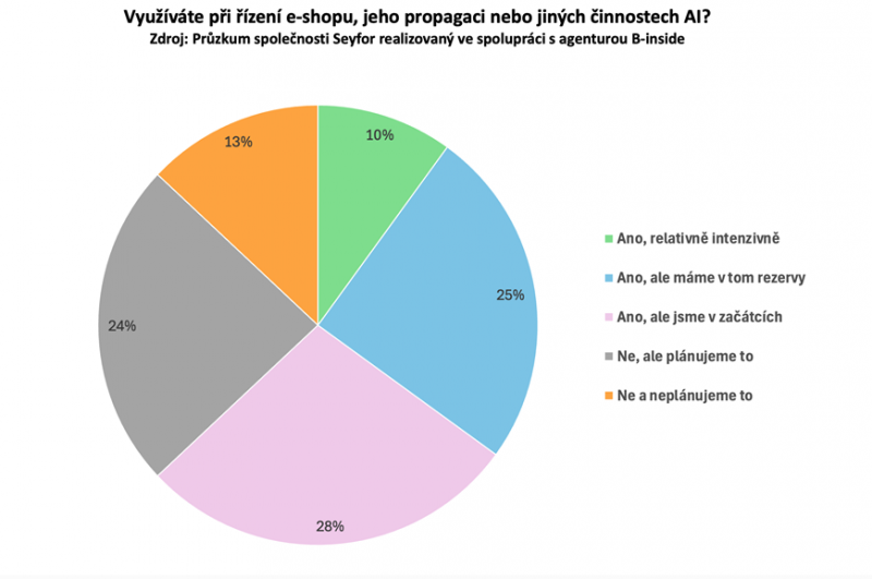 5.11. – Umělá inteligence se v české a slovenské e-commerce prosazuje, její využívání je však zatím soustředěno především na jednodušší operativní úkony. Podle aktuálního průzkumu společnosti Seyfor realizovaného ve spolupráci s agenturou B-inside využívá AI intenzivně pouze deset procent e-shopů, zatímco více než čtvrtina firem je teprve na úplném začátku a třináct procent s jejím nasazením vůbec nepočítá.