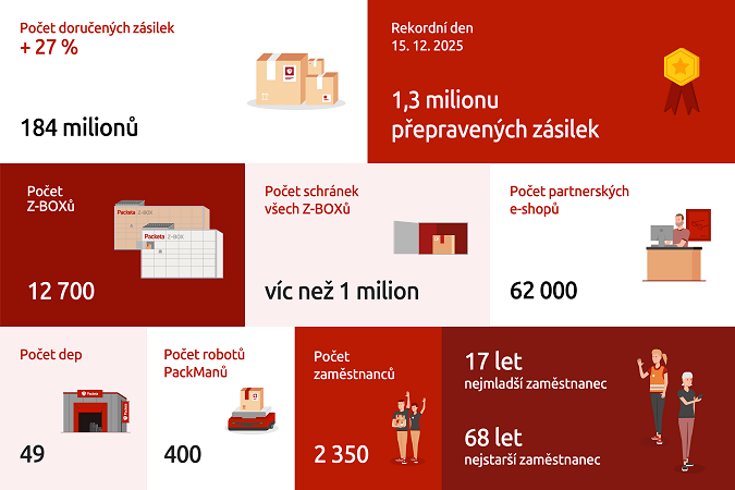 8.2. - Loňský rok byl pro skupinu Packeta, do které patří i česká logistická firma Zásilkovna, rekordní. Počet doručených zásilek narostl meziročně o 40 milionů. Packeta dál výrazně rozšiřovala svou síť výdejních boxů v Česku, na Slovensku i v Maďarsku, a tak překonala milník jednoho milionu schránek. Růst sítě odráží sílící poptávku zákazníků, kteří chtějí sami rozhodovat o čase převzetí zásilky.