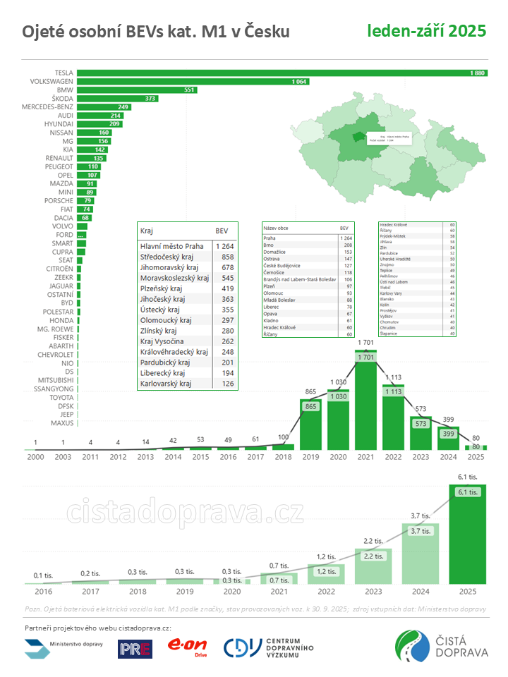 K 30. září 2025 bylo podle CDV v Česku registrováno téměř 52 tisíce osobních bateriových elektromobilů kategorie M1, z toho 15,2 tisíce byly dovezené ojetiny, což představuje 29,2 % celkového počtu. V období od ledna do září 2025 bylo dovezeno 6,1 tis. ojetých osobních bateriových elektromobilů kategorie M1, což je 2,4násobný meziroční nárůst (pozn. tato data reflektují stav provozovaných vozidel k 30. 9. 2025, očištěný o vozidla zaniklá, vyřazená z provozu či vyvezená.) Téměř každý třetí letos dovezený ojetý elektromobil byl Tesla, která si připsala nejvíce registrací (1 880 vozidel, tj. 30,9 %). Následovaly Volkswagen (1 064 vozidel), BMW (551 vozidel), Škoda (373 vozidel), Mercedes-Benz (249 vozidel), Audi (214 vozidel) a Hyundai (209 vozidel). V podílu registrací mírně převažovaly registrace na soukromé osoby (54,3 %), které nejvíce preferovaly Teslu (1 062 vozidel), Volkswagen (592 vozidel) a BMW (248 vozidel), preference firem byly podobné: Tesla (818 vozidel), Volkswagen (472 vozidel) a BMW (303 vozidel).