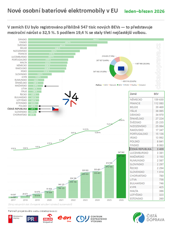 28.4. - Trh s novými osobními bateriovými elektromobily v Evropské unii v prvním čtvrtletí roku 2026 rostl – jejich registrace se meziročně zvýšily o 32,5 % na 547 tisíc vozidel. Také Česká republika zaznamenala meziroční nárůst (o 10,5 %), podíl elektromobilů na nových registracích však zůstává výrazně pod evropským průměrem. Zatímco v EU dosáhl tržní podíl bateriových elektromobilů 19,4 % (15,2 % v 1–3/2025), v České republice činil 5,7 % (5,2 % v 1–3/2025). Údaje vycházejí z aktualizovaných dat webu cistadoprava.cz, založených na statistikách Evropského sdružení výrobců automobilů a dalších relevantních zdrojích. V tiskové zprávě o tom informovalo Centrum dopravního výzkumu.