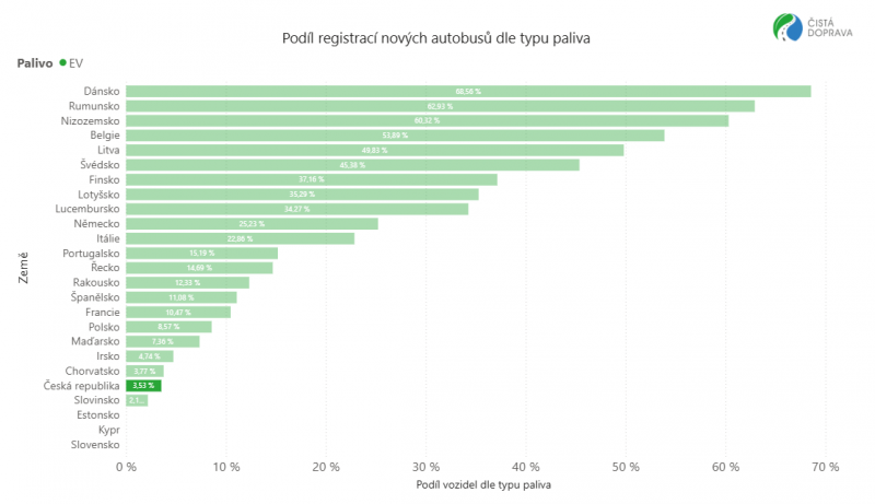 V Česku klesl celkový prodej autobusů o 35,3 % na 595 kusů. Naftové motorizace zůstávají dominantní volbou (93,1 % trhu), jejich prodej klesl o 33,3 %. Celkem bylo registrováno 21 elektrobusů, tržní podíl dosáhl 3,5 %. Z pohledu značek byly zastoupeny MAN (11), Iveco Bus (8) a Solaris (2 vozidla). Aktuálně je na českých silnicích v provozu 228 bateriových elektrobusů kategorie M2 (2 vozidla) a M3 (226 vozidel).