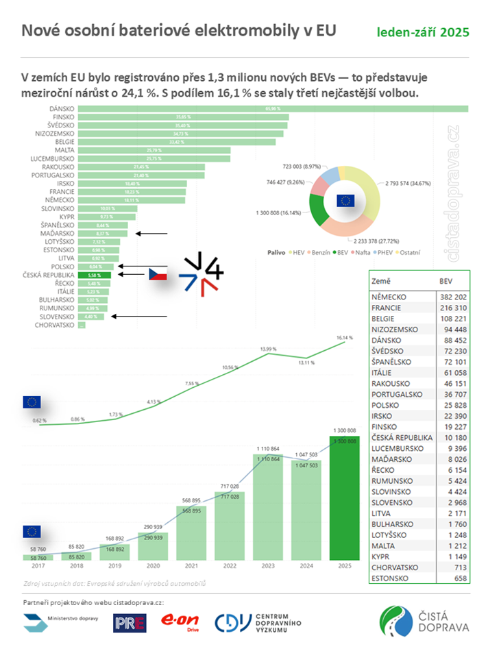 1.11. - Během prvních devíti měsíců roku 2025 se v zemích Evropské unie registrovalo o 24,1 % více bateriových elektromobilů než ve stejném období loni. Česká republika se řadí k nejrychleji rostoucím trhům v rámci celé EU – s meziročním nárůstem registrací o 41,2 % obsadila deváté místo. Podíl elektromobilů na nových registracích ale u nás zatím zaostává za evropským průměrem. Zatímco v Česku tvoří 5,6 % všech nově registrovaných aut, v EU je to už 16,1 %. Přesto jde o posun: ještě loni ve stejném období činil podíl 4,2 %, v EU pak 13,1 %. Vyplývá to z aktualizovaných informací webu cistadoprava.cz, které vycházejí ze zdrojových dat Evropského sdružení výrobců automobilů. Informovalo o tom Centrum dopravního výzkumu v tiskové zprávě.