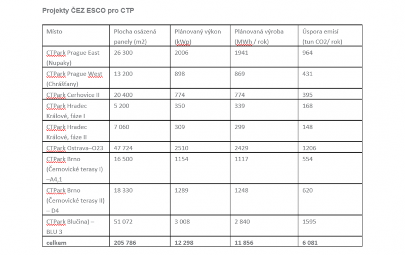 Fotovoltaické elektrárny v lokalitě CTParku Brno (Černovické terasy I, II) a Brno South (Blučina) ročně vyrobí přes 5,2 GWh bezemisní energie, objem odpovídající spotřebě 1 500 průměrných domácností. Soláry běží ve zkušebním provozu na Černovických terasách na dvou střechách v místní průmyslové zóně. V Blučině ČEZ ESCO aktuálně dokončuje největší střešní fotovoltaiku na jižní Moravě o výkonu 3 MWp.