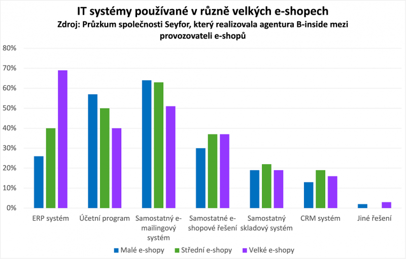 Vedle účetních a ERP systémů hrají významnou roli také samostatné e-mailingové nástroje. Ty využívají zhruba dvě třetiny malých a středních e-shopů a více než polovina velkých. Právě práce se zákazníky, marketingová automatizace a komunikace se v průběhu růstu e-shopu ukazují jako oblasti, které nelze dlouhodobě řešit ad hoc.