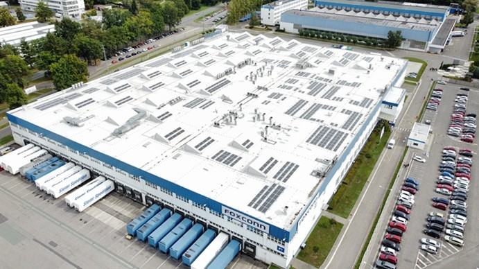 Na střechu závodu Foxconn v Pardubicích bylo umístěno více než tisíc odlehčených solárních panelů, které jsou až o polovinu lehčí než běžné skleněné panely.